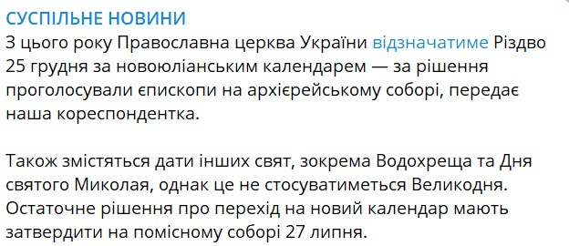 Нагадаємо, 2021 року голова ПЦУ Єпіфаній заявляв, що протягом 10 років українці перейдуть на святкування Різдва 25 грудня. Такий термін він пояснював тим, що дата 25 грудня для Різдва - не популярна серед українців, тому у разі перенесення дати - "храми 25 будуть порожніми, а 7 будуть повними".