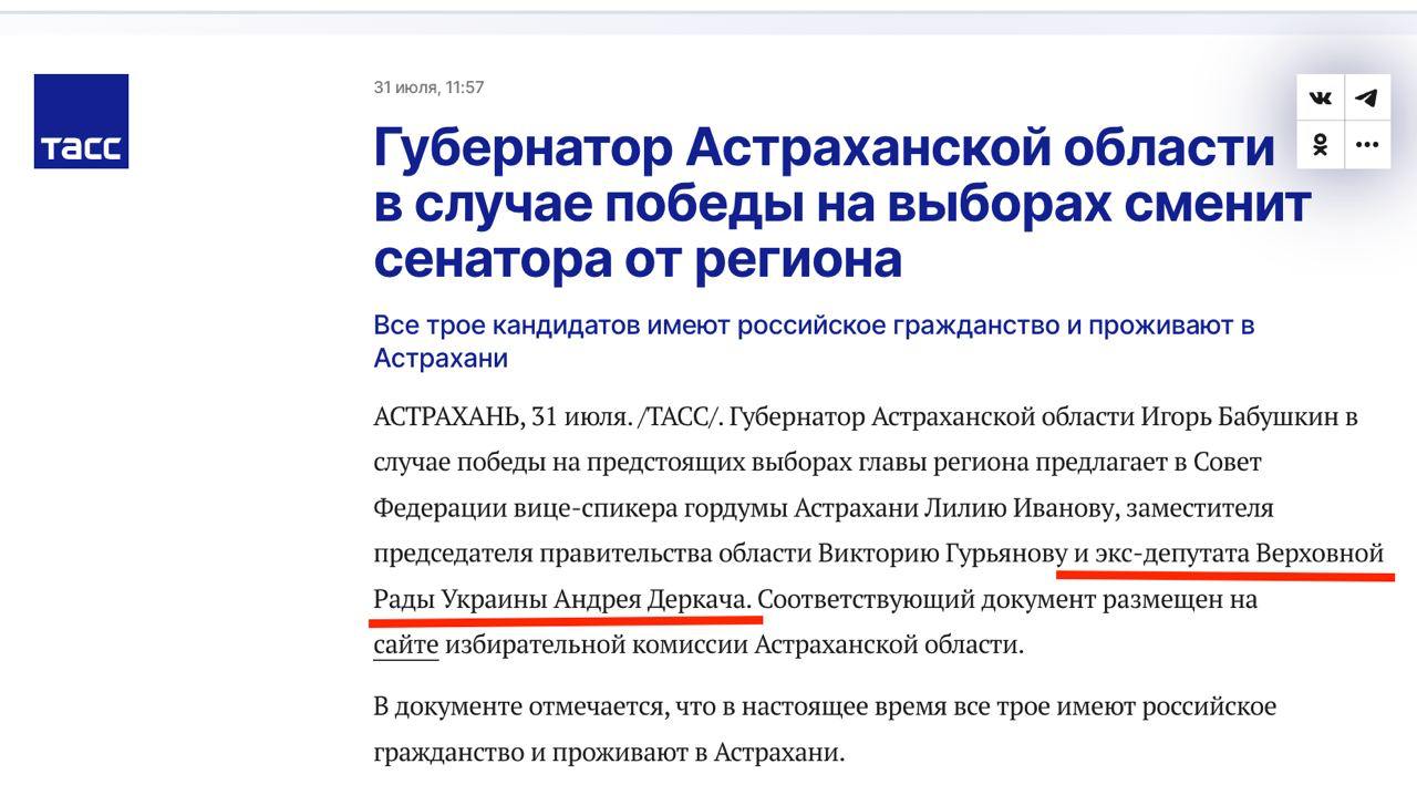 "Губернатор Астраханської області Ігор Бабушкін у разі перемоги на майбутніх виборах глави регіону пропонує до Ради Федерації віце-спікера гордуми Астрахані Лілію Іванову, заступника голови уряду області Вікторію Гур'янову та екс-депутата Верховної Ради України Андрія Деркача", - сказано в повідомленні.