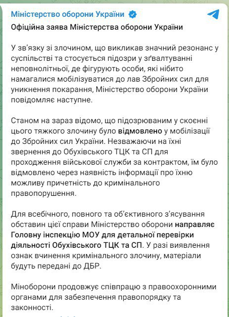 "Незважаючи на їх звернення до Обухівського ТЦК та СП для проходження військової служби за контрактом, їм було відмовлено через наявність інформації про їхню можливу причетність до кримінального правопорушення", - повідомили у відомстві.