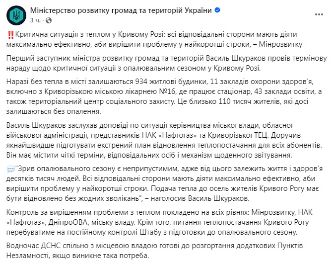 Перший заступник міністра розвитку громад та територій Василь Шкураков провів термінову нараду щодо ситуації у місті. Він заслухав доповіді міської влади, обласної військової адміністрації, представників "Нафтогазу" та Криворізької ТЕЦ та доручив якнайшвидше підготувати екстрений план відновлення теплопостачання всім абонентам.