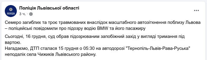 "За попередніми даними, загинуло троє людей. Ще 35 мають травми різної тяжкості. Серед постраждалих є шестеро дітей. На місце ДТП виїжджали 11 бригад медиків", - повідомив голова Львівської ОВУ.