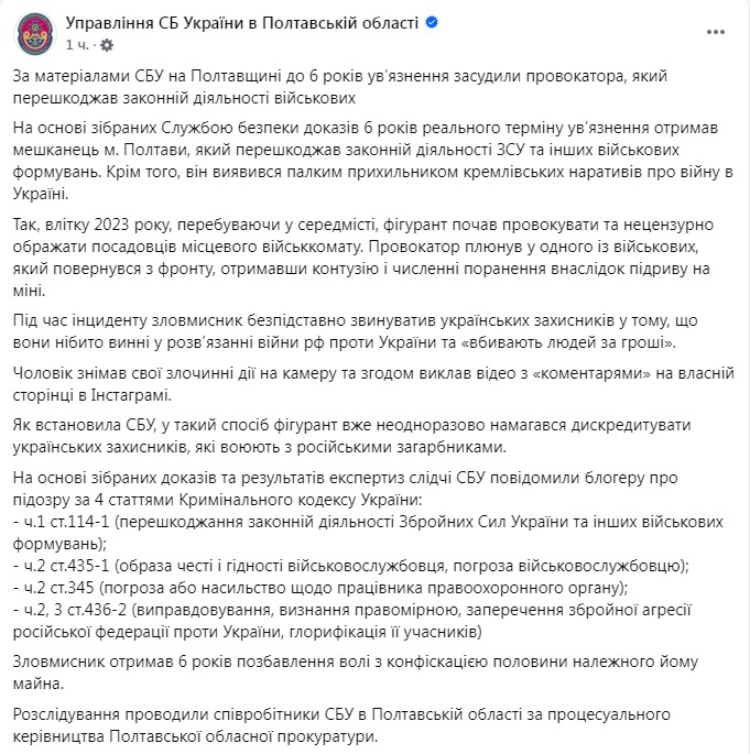 У Полтаві засудили до шести років в'язниці місцевого блогера та фітнес-тренера Романа Заволоку, котрий влітку 2023 року ошукав співробітника ТЦК і плюнув у нього.