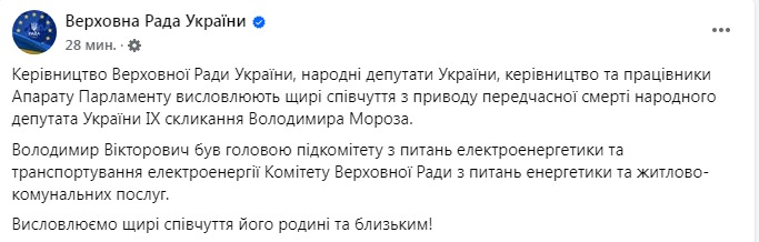 "Керівництво Верховної Ради України, народні депутати України, керівництво та працівники Апарату Парламенту висловлюють щирі співчуття з приводу передчасної смерті народного депутата України IX скликання Володимира Мороза", - сказано у публікації парламенту.