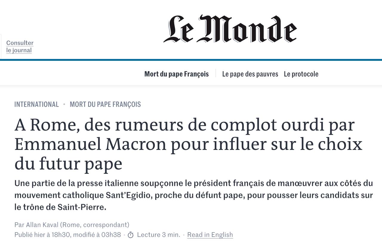 Нещодавно Макрон пообідав у французькому посольстві при Святому Престолі із чотирма французькими кардиналами-виборцями. Серед них був Жан-Марк Авелін, архієпископ Марселя, який вважається одним із кандидатів на посаду нового папи. А пізніше французький президент повечеряв у ресторані із засновником громади святого Егідія Андреа Рікарді. Прелат із лав цієї організації Маттео Дзуппі, близький до покійного папи архієпископ Болоньї та президент Італійської єпископської конференції теж вважається претендентом на посаду папи. При цьому його позиція розходиться з курсом уряду Італії Джорджі Мелоні.