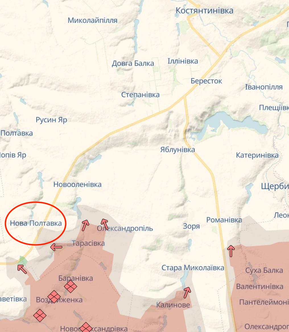 Армія РФ продовжує просуватися в районі траси Покровськ-Костянтинівка і зайшла вже до Нової Полтавки з того боку дороги.