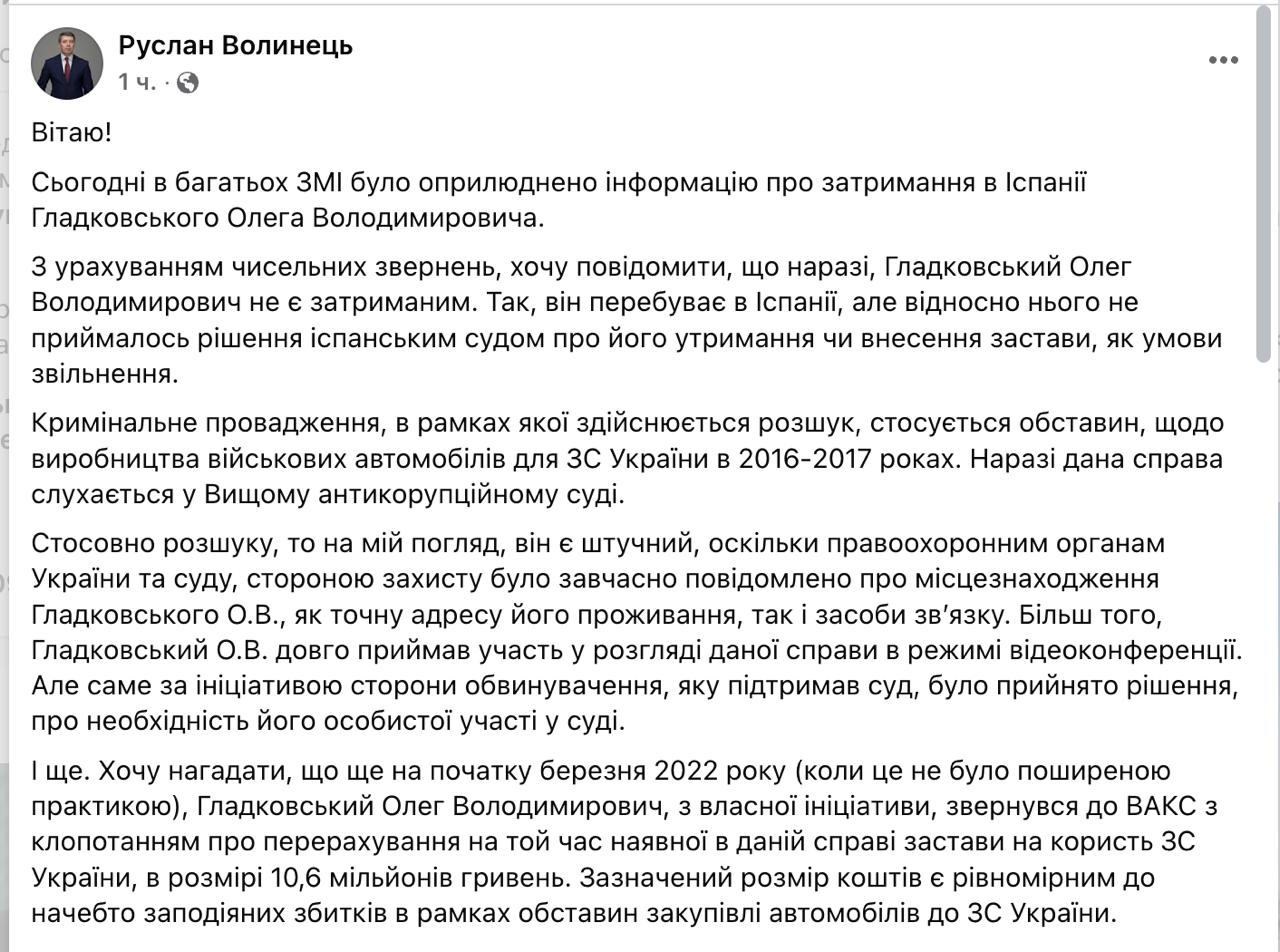 "Гладковського Олега Володимировича не затримано. Так, він перебуває в Іспанії, але щодо нього не приймалося рішення іспанським судом про його утримання або внесення застави як умови звільнення", - пише Руслан Волинець.