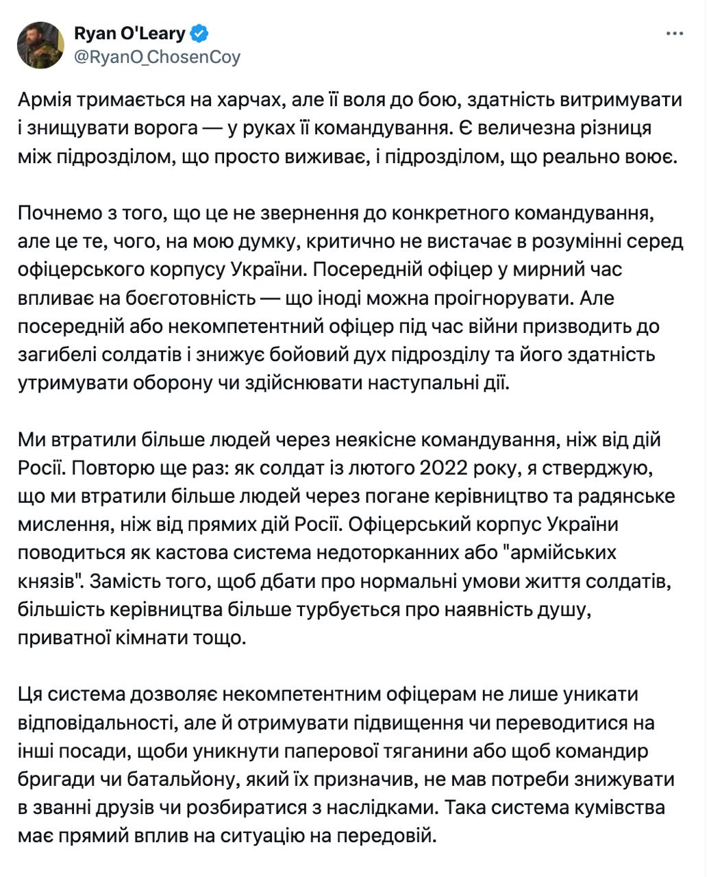 "Як солдатів з лютого 2022 року, я стверджую, що ми втратили більше людей через погане керівництво і радянське мислення, ніж від прямих дій Росії. Офіцерський корпус України поводиться як кастова система недоторканних або армійських князів. командир бригади або батальйону, який їх призначив, не мав потреби знижувати у званні друзів або розбиратися з наслідками. Така система кумівства має прямий вплив на ситуацію на передовій", - написав О'Лірі.
