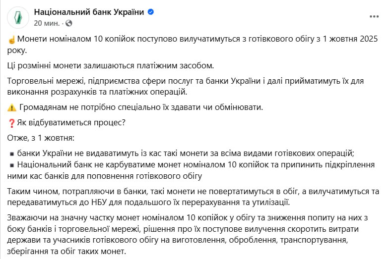 "Ці розмінні монети залишаються платіжним засобом. Торгові мережі, підприємства сфери послуг та банки України й надалі прийматимуть їх для виконання розрахунків та платіжних операцій. Громадянам не потрібно спеціально їх здавати чи обмінювати", - йдеться у повідомленні.