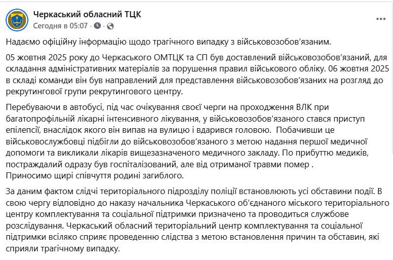 Усі обставини трагедії нині з'ясовують слідчі, а ТЦК йде службове розслідування.