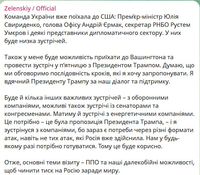 За словами президента, до США попрямували прем'єр-міністр Юлія Свириденко, голова Офісу президента Андрій Єрмак, секретар РНБО Рустем Умеров та деякі представники дипломатичного сектора.