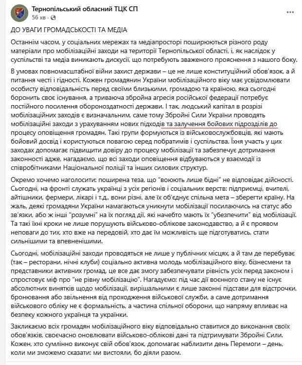 Про це повідомляє прес-служба Тернопільського обласного ТЦК та СП на своїй сторінці у Facebook.