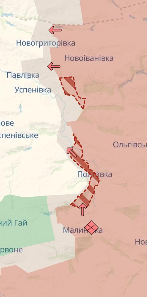 10:18 Армія РФ просунулась на трьох дільницях на заході Запорізької області, повідомляє Deep State. А саме, біля Новоіванівки, Малинівки та у Полтавці.
