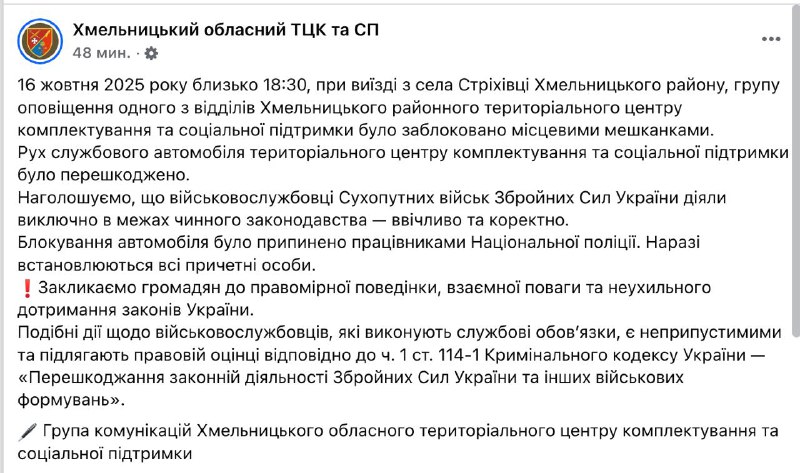 08:29 У селі Стрехівці на Хмельниччині стався інцидент за участю представників ТЦК.