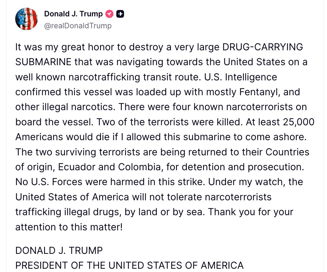 "За даними розвідки, субмарину було завантажено фентанілом та іншими наркотиками. Якби я дозволив їй досягти берега, загинули б не менше 25 тисяч американців", - написав Трамп.