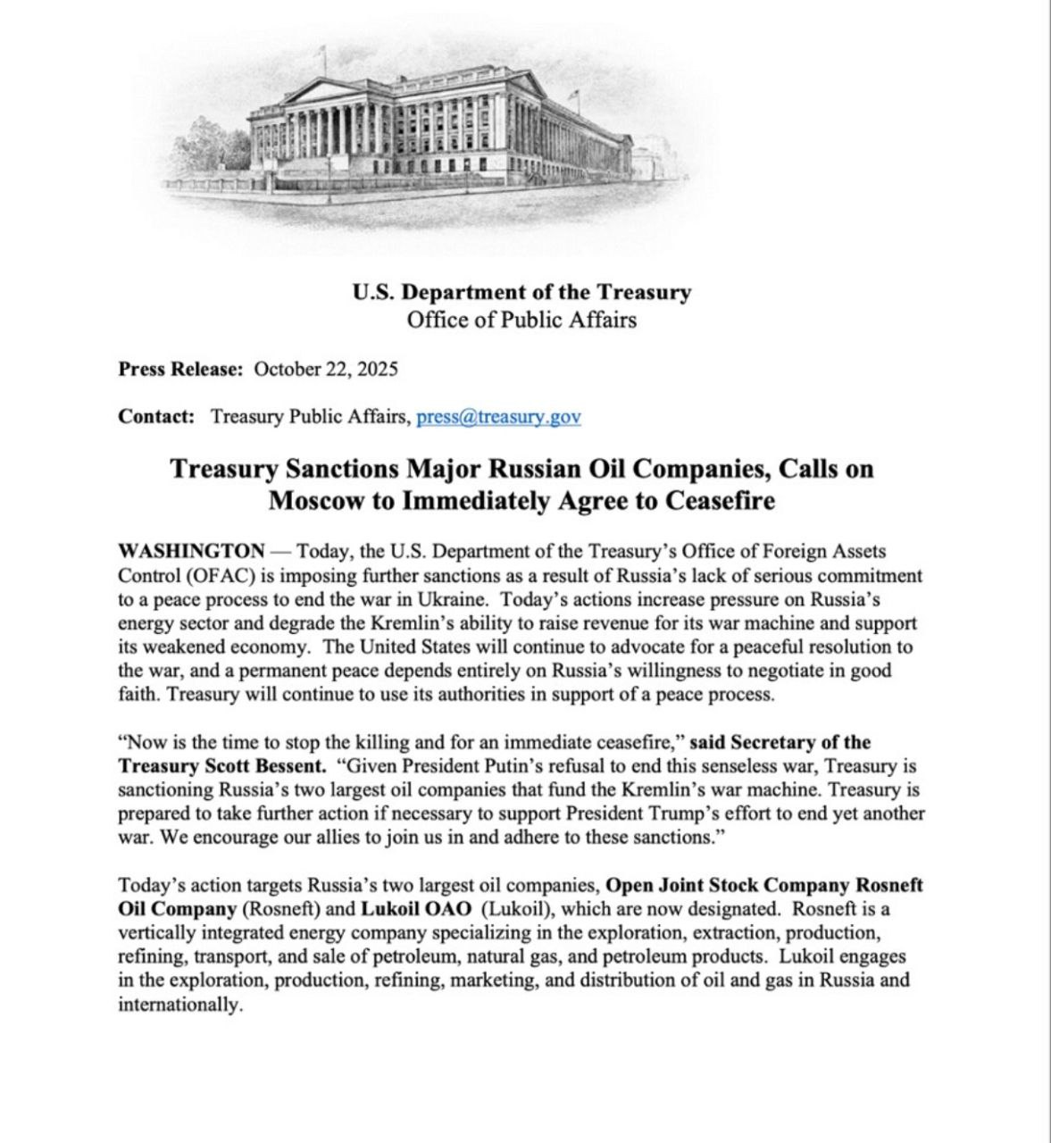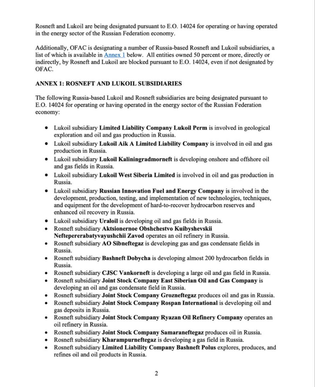 Усі активи та майнові інтереси "Роснефти" та "Лукойлу", що перебувають у США або під контролем американських осіб, блокуються. Будь-які операції за участю цих компаній заборонені для громадян та юридичних осіб США, а також для всіх транзакцій, що проходять через американську фінансову систему (зазначимо, що один із найбільших покупців російської нафти – Індія – платить за паливо в юанях ).