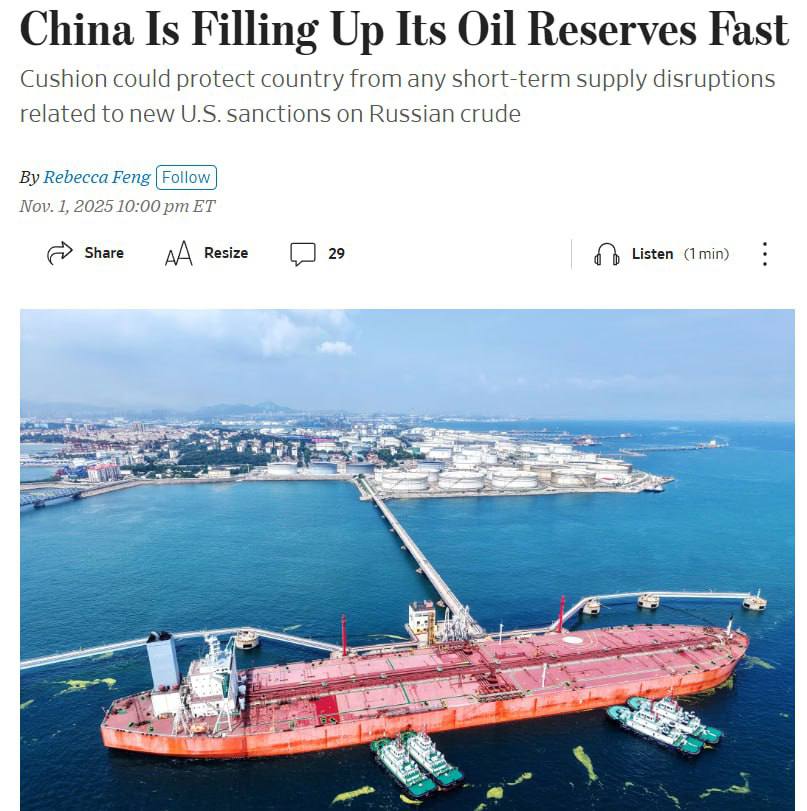 На думку експертів, незважаючи на те, що накопичення запасів триватиме до кінця року, швидше за все китайські НПЗ не скоротять закупівлі російської нафти через санкції проти "Роснафти" та "Лукойлу", які не дозволяють їм проводити операції в доларах.