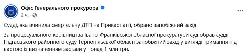 "При процесуальному керівництві Івано-Франківської обласної прокуратури суд обрав судді Підгаєцького районного суду Тернопільської області запобіжний захід у вигляді утримання під вартою з визначенням застави понад 1 млн грн", - йдеться у повідомленні.