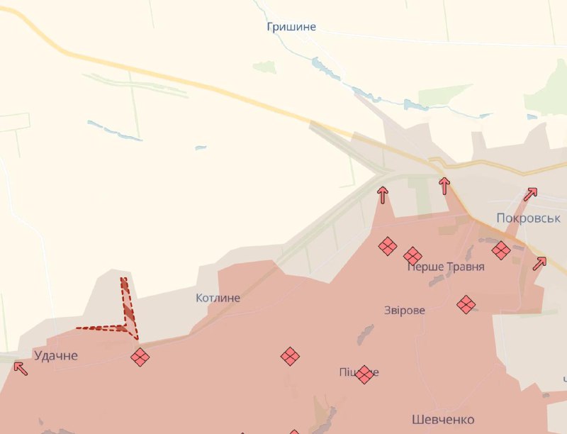 13:54 Армія РФ різко просунулась до Мирнограду, що біля Покровська, і біля Вдалого у напрямку траси на Павлоград, повідомляє Deep State.