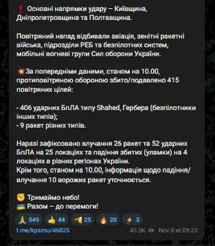 У ніч на 8 листопада армія РФ завдала комбінованого удару по об'єктах критичної інфраструктури України з використанням ударних безпілотників та ракет повітряного, наземного та морського базування.