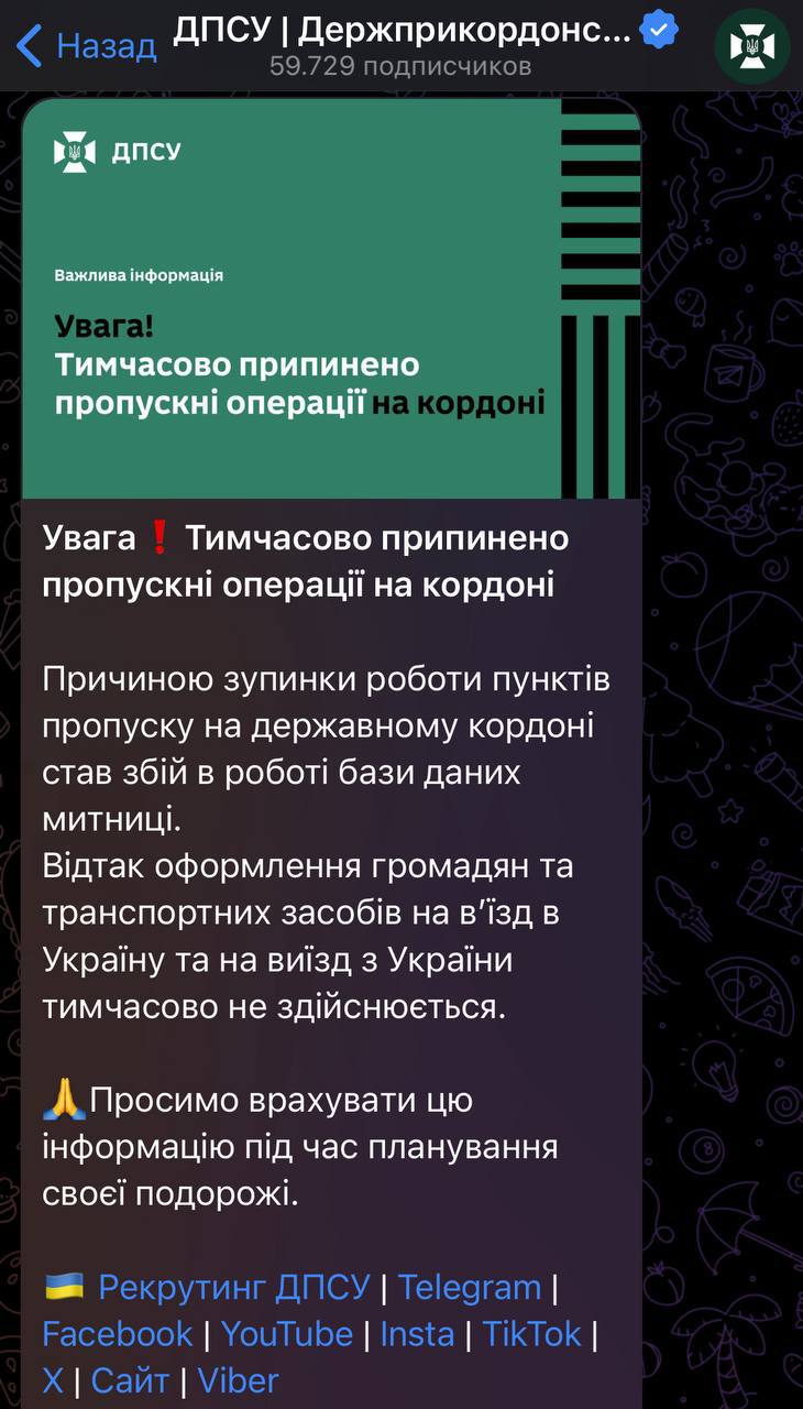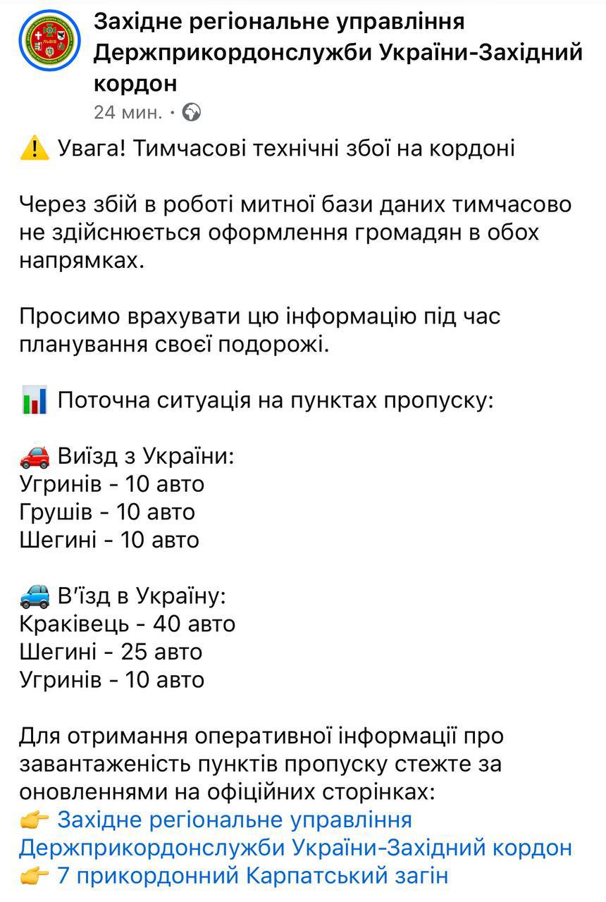 Заявляється, робота над усуненням збою вже ведеться і обіцяє, що пункти пропуску незабаром знову запрацюють у штатному режимі.