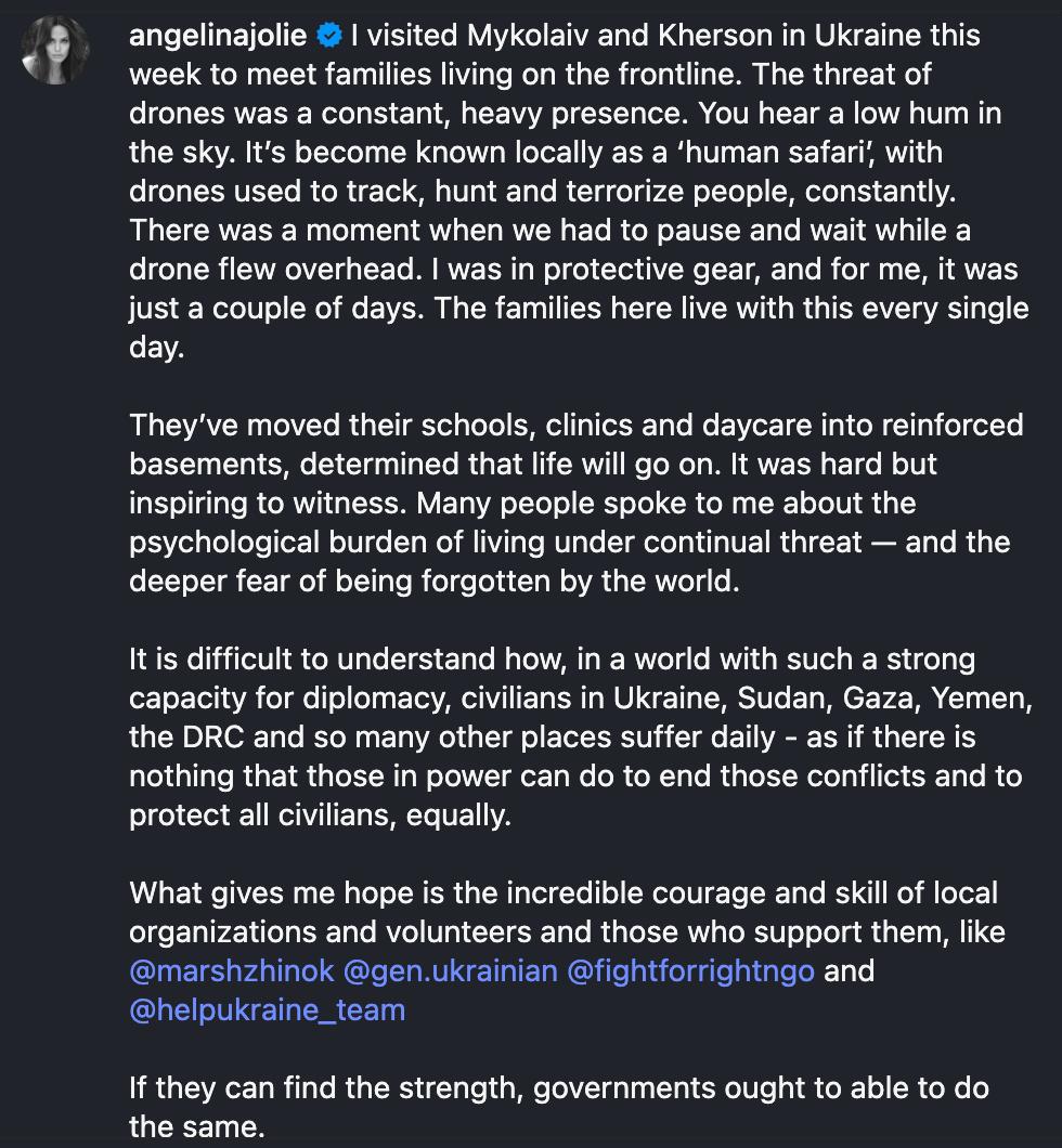 Пост, присвячений візиту до Херсона, Джолі опублікувала на своїй сторінці у Instagram.