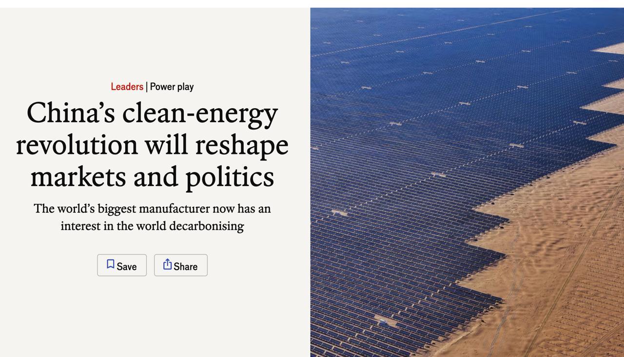 The Economist зазначає, що Китай став "новим типом наддержави" – енергетичним. Він здатний виробляти майже терават відновлюваних потужностей на рік, що можна порівняти з 300 великими атомними електростанціями. Завдяки масштабному виробництву собівартість енергії постійно знижується, а внутрішній попит стимулює подальше зростання.