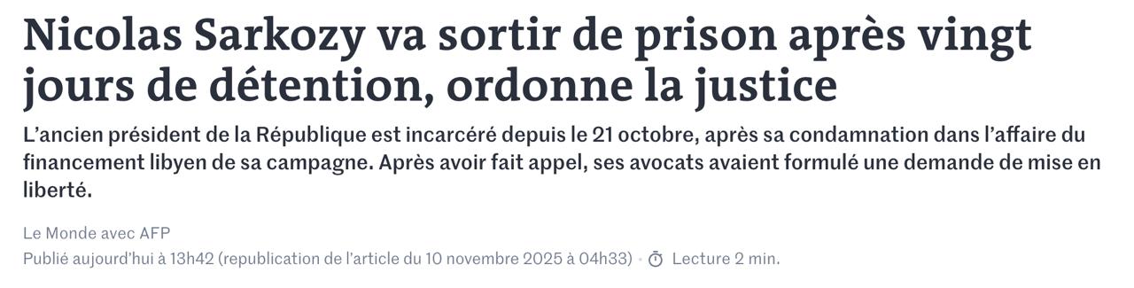 Нагадаємо, 21 жовтня Саркозі почав відбувати своє покарання у паризькій в'язниці Санте. Його засудили до п'яти років ув'язнення за злочинну змову у справі про лівійське фінансування його виборчої кампанії. Він став першим в історії Франції екс-президентом, який вирушив за ґрати.