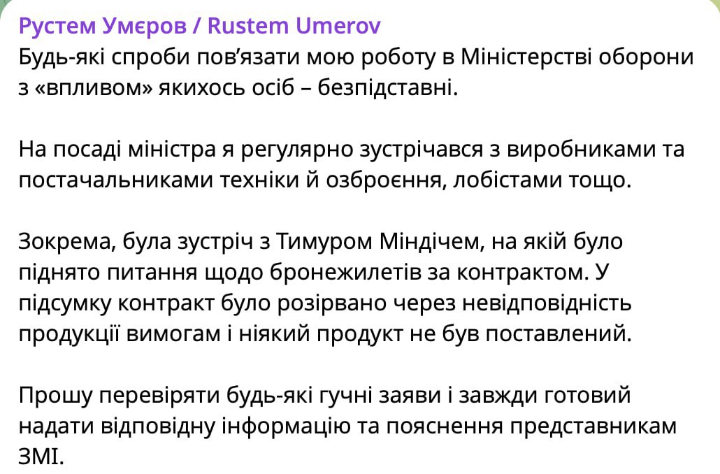 "Зокрема, була зустріч з Тимуром Міндічем, на якій було порушено питання про бронежилети за контрактом. В результаті контракт був розірваний через невідповідність продукції вимогам і жодного продукту не було поставлено", - повідомив Умеров.