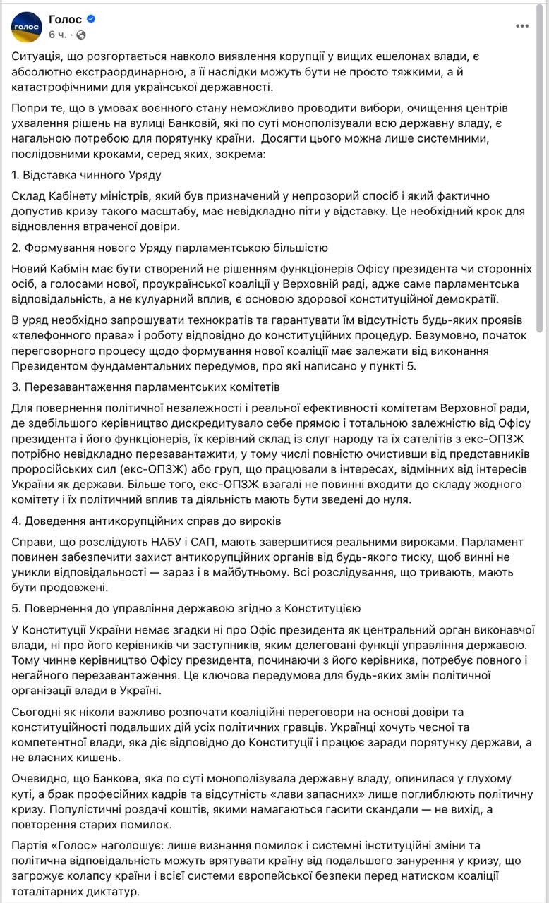 "Ситуація, що розгортається навколо виявлення корупції у вищих ешелонах влади, є абсолютно екстраординарною, а її наслідки можуть бути не просто важкими, а й катастрофічними для української державності. Незважаючи на те, що в умовах військового становища неможливо проводити вибори, очищення центрів прийняття рішень на вулиці Банковій, які по суті монополізували всю Україну. згадки ні про Офіс президента як центральний орган виконавчої влади, ні про його керівників або заступників, яким делеговані функції управління державою. Тому чинне керівництво Офісу президента, починаючи з його керівника, потребує повного і негайного перезавантаження.