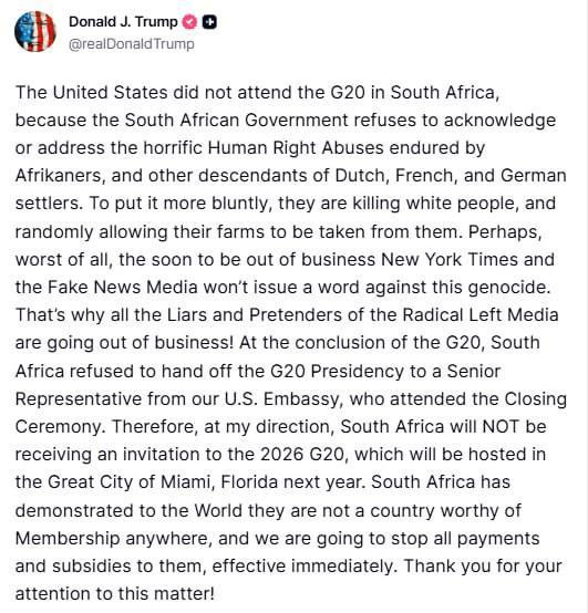 "Сполучені Штати не були присутні на саміті G20 у Південній Африці, тому що уряд Південної Африки відмовляється визнавати або вирішувати жахливі порушення прав людини, яким зазнають африканери та інші нащадки голландських, французьких і німецьких поселенців. Якщо говорити більш прямо, вони вбивають білих людей і безладно дозволяють забирати у них ферми. Можливо, найгірше те, що скоро збанкрутіла The New York Times і фейкова преса новин не скажуть ні слова проти цього геноциду. Ось чому всі брехуни і удавачі з радикально лівих медіа розоряються! Після завершення саміту G20 Південна Африка відмовилася передати головування у G20 старшому представнику нашого посольства США, який був присутній на церемонії закриття. Отже, за моєю вказівкою, Південна Африка не отримає запрошення на G20 2026, який наступного року проводитиметься у великому місті Майамі, Флорида. Південна Африка продемонструвала світу, що вона не є країною, гідною членства будь-де, і ми негайно припиняємо всі виплати та субсидії їм", - написав президент США.