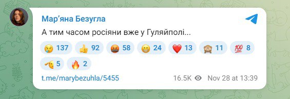 Безугла заявила, що російські війська увійшли до Гуляйполя