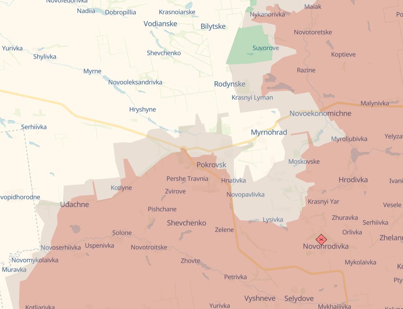 На ділянці Родинське – Гришине зафіксовано просування російських груп на кількох напрямках. Росіяни вийшли на захід від перехрестя дороги на Гришине, а окремі підрозділи закріпилися на південно-східній околиці самого Гришина. На південь від Родинського українські сили поки не змогли зупинити просування РФ, що збільшує глибину охоплення покровського вузла та погіршує становище оборони у Мирнограді.