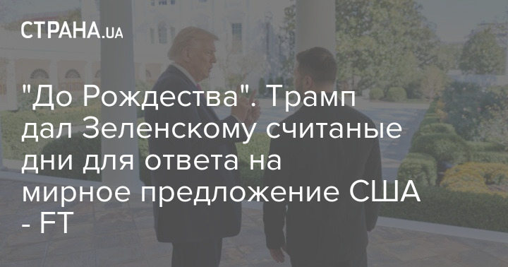 Видання зазначає, що Зеленський повідомив своїх європейських колег, що в ході двогодинної телефонної розмови в суботу спецпредставник Трампа Стів Уіткофф та зять президента США Джаред Кушнер наполегливо вимагали від нього ухвалення швидкого рішення. Джерело, знайоме із запропонованими Києву термінами, повідомило, що Трамп сподівається на укладення угоди "до Різдва" (тобто до 25 грудня).