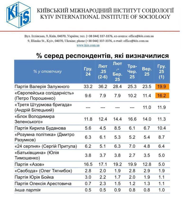 Згідно з його даними, 19,9% громадян, що визначилися, віддали б голос за умовну партію екс-главкому ВСУ та чинного посла України у Великій Британії Валерія Залужного. На другому місці – партія "Євросолідарність" Петра Порошенка (16,2%), а замикає топ-3 гіпотетична партія командира Третього корпусу Андрія Білецького "Третя штурмова бригада" – 11,9%.