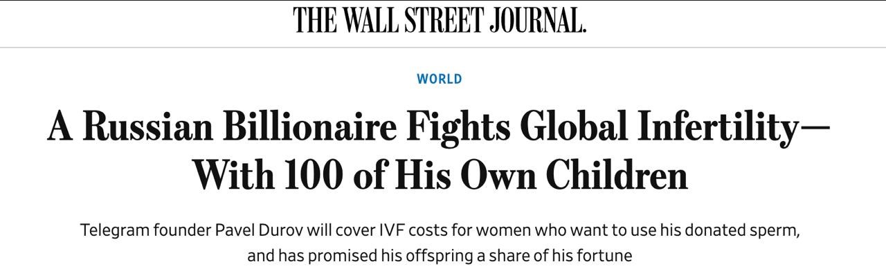 Засновник месенджера Telegram Павло Дуров готовий сплатити витрати на екстракорпоральне запліднення (ЕКЗ) для всіх незаміжніх жінок віком до 38 років, які бажають використати його донорську сперму для запліднення, і обіцяє своїм дітям частку від свого статку, який оцінюється в 17 мільйонів доларів.