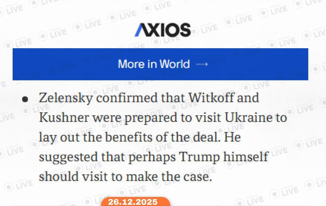 За словами глави держави, спецпредставники президента США Стівен Уіткофф та Джаред Кушнер готові відвідати Україну, щоб викласти переваги угоди.