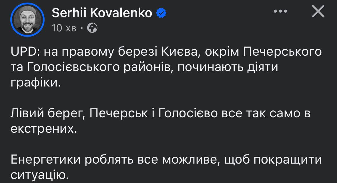 18.29 На більшій частині правого берега Києва відмінено екстрені відключення світла, тут починають діяти графіки, повідомив гендиректор YASNO Коваленко.