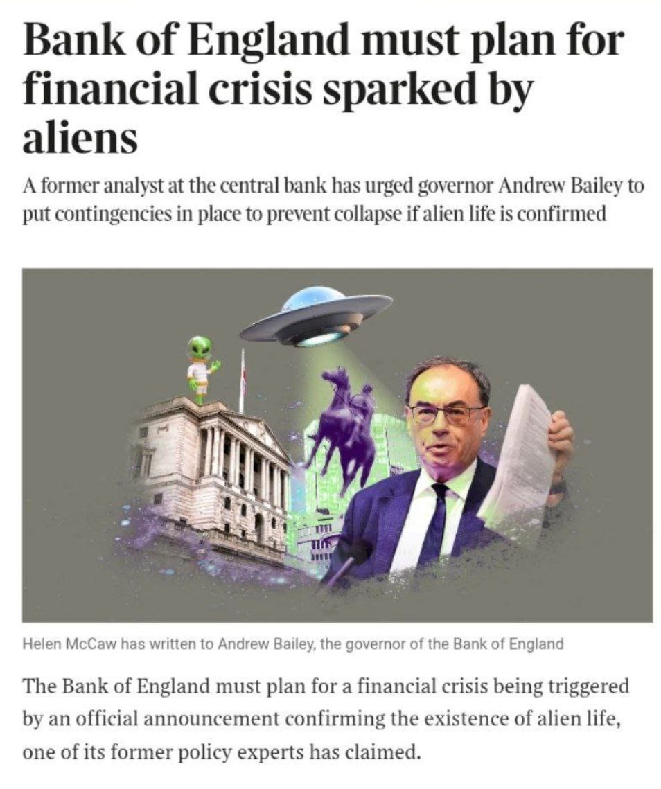 Банк Англії має готуватися до можливої фінансової кризи через підтвердження існування інопланетян.