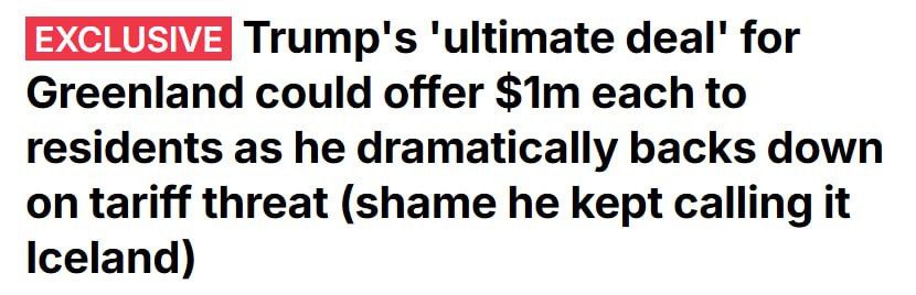 Тим часом британська Daily Mail із посиланням на джерела написала, що адміністрація Трампа хоче запропонувати кожному мешканцю Гренландії по мільйону доларів у разі голосування за приєднання острова до США. На острові налічується близько 57 тисяч жителів, тобто виплати становитимуть 57 мільярдів доларів.