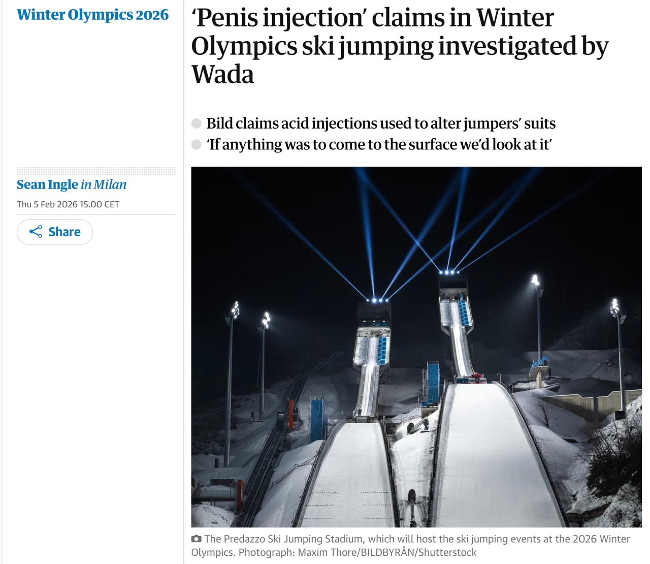 Всесвітнє антидопінгове агентство (WADA) розслідує заяви преси про ін'єкції в пеніс олімпійськими стрибунами з трампліну. Як пишуть журналісти, така процедура сприяє збільшенню дальності стрибків, хоч прямих доказів використання уколів немає.