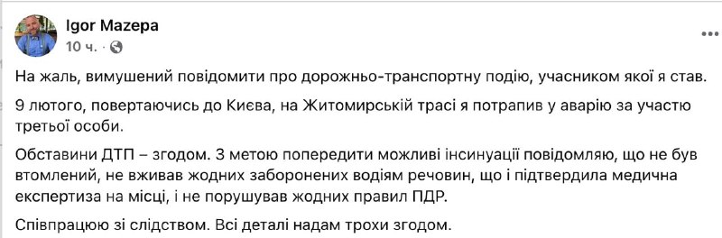"На жаль, вимушений повідомити про дорожньо-транспортну подію, учасником якої я став. 9 лютого, повертаючись до Києва, на Житомирській трасі я потрапив у аварію за участю третьої особи. Обставини ДТП – згодом. З метою попередити можливі інсинуації повідомляю, що не був втомлений, не вживав жодних заборонених водіям речовин, що і підтвердила медична експертиза на місці, і не порушував жодних правил ПДР. Співпрацюю зі слідством. Всі деталі надам трохи згодом", - написав Мазепа.