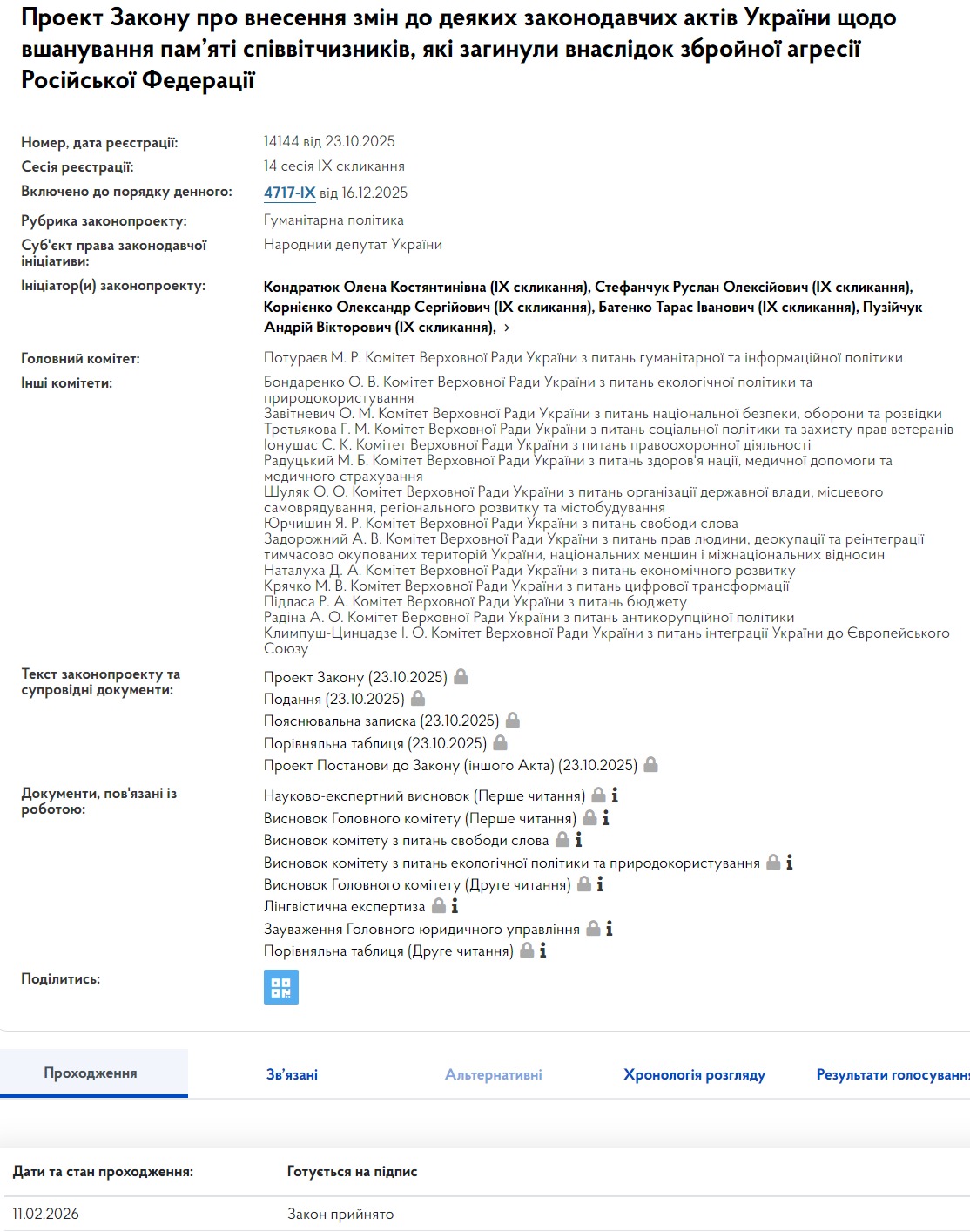 Про це свідчить статус документа на сайті парламенту. Його повна назва – проект закону про внесення змін до деяких законодавчих актів України щодо пам'яті співвітчизників, які загинули внаслідок збройної агресії Російської Федерації.