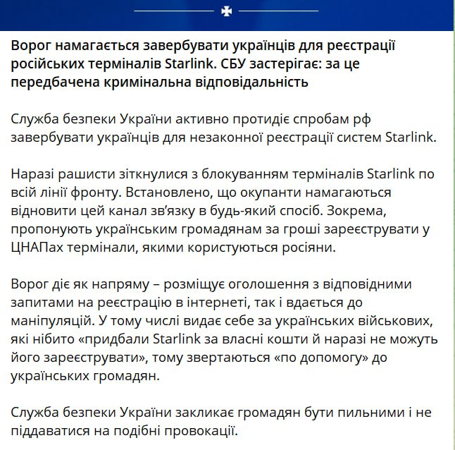 "Ворог діє як напрям - розміщує оголошення з відповідними запитами на реєстрацію в інтернеті, і примудряється маніпулювати. У тому числі видаючи себе за українських військових, які нібито "придбали Starlink за свій рахунок і на даний час не можуть його зареєструвати", тому звертаються за "допомогу" до громадян", - йдеться у повідомленні.