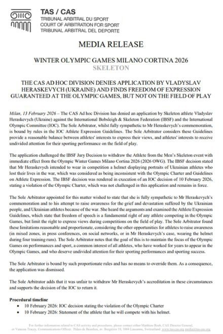 Спортивний арбітражний суд у Лозанні відхилив позов українського скелетоніста Владислава Гераскевича проти Міжнародного олімпійського комітету та Міжнародної федерації скелетону (IBSF).
